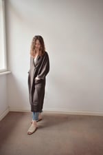 The Ursula Brown linen duster coat features two roomy side pockets and it has a button closure. This coat will accents your whole outfit.